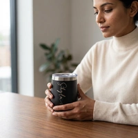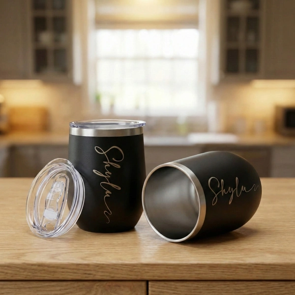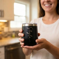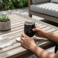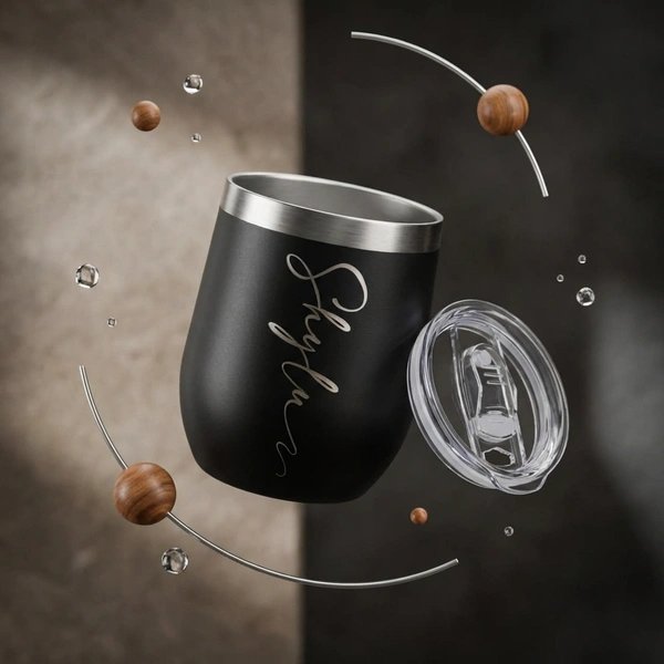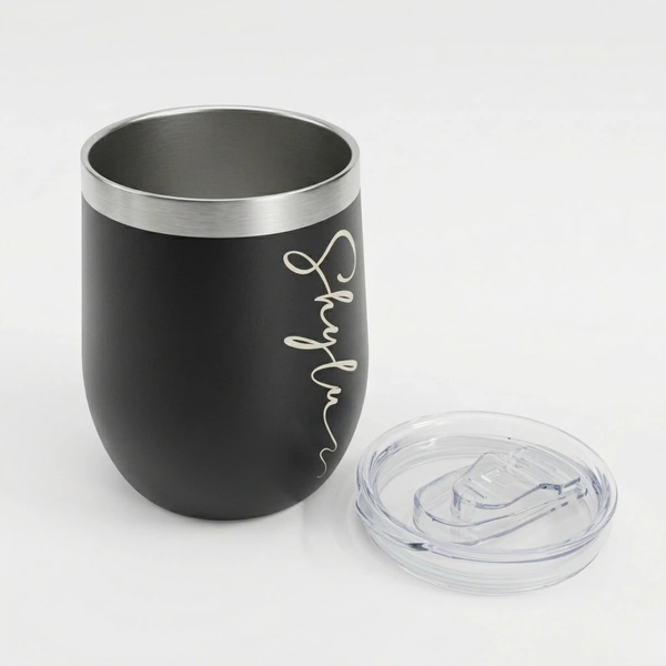 Elevate your drinkware collection with this Personalized Matte Black Stainless Steel Tumbler. Featuring a sophisticated matte finish and a custom-engraved script, this tumbler isn't just a mug—it's a statement piece. Its ergonomic, egg-shaped design fits comfortably in your hand, while the splash-resistant clear lid ensures you can take your coffee, tea, or wine on the go without the mess.