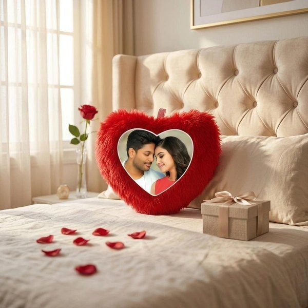 urn your favorite moments into a cozy masterpiece. This 14x14 inch heart cushion features a striking red faux-fur border that frames your chosen photograph, creating a stunning visual centerpiece for any sofa, bed, or armchair. The plush texture provides a luxurious feel, while the high-quality print ensures your memories stay vivid and clear.